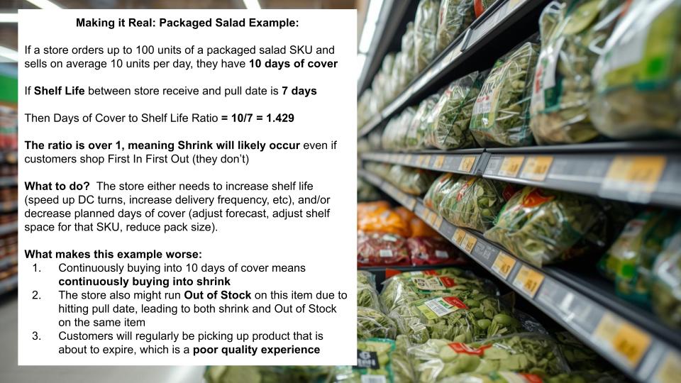 Based on my grocery supply chain experience, including building Amazon's produce, meat, and fish supply chain and developing grocery inventory optimization software, I’ve consistently seen that the most actionable way to analyze shrink is to break it down to its components of days of cover and shelf life, and look for when days of cover is exceeding shelf life (ratio > 1).