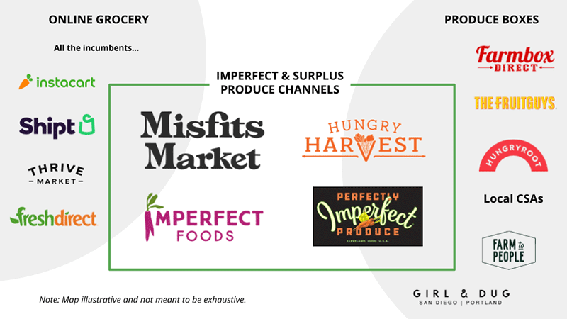 It was also around this time that large retailers like Walmart and Whole Foods piloted selling ugly produce, which was quietly ended by 2019 due to low customer interest. Going back to boxes, it was only around 2017 that Misfits and Imperfect (and Hungry Harvest to a lesser extent) responded by raising a lot of capital to throw at the opportunity to build organizations that could source broadly and also service more of the U.S. than any imperfect box before it. It is difficult for these companies to be truly defensible from a new entrant with a similar-looking platform, more selection, lower prices, etc. – a competitive environment that led to a "land grab" strategy.